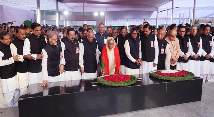পরে আওয়ামী লীগের কেন্দ্রীয় নেতাদের সাথে নিয়ে আওয়ামী লীগ সভাপতি শেখ হাসিনা বাংলাদেশের স্থপতি জাতির পিতা বঙ্গবন্ধু শেখ মুজিবুর রহমানের প্রতিকৃতিতে দলের পক্ষে পুষ্পস্তবক অর্পণ করেন।