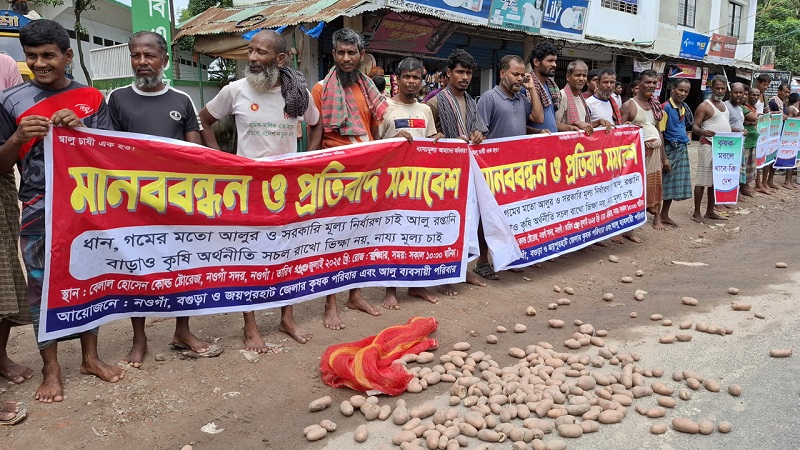 ধান-গমের মতো আলুর সরকার কতৃক মূল্য নির্ধারণের দাবিতে মানববন্ধন ও প্রতিবাদ সমাবেশ করেছে নওগাঁর আলু চাষিরা। বুধবার (৩০ জুলাই) সকাল